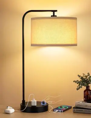 Tall Table Lamp with USB Port and Outlet, Dimmable Nightstand Bedside Lamps with Linen Lampshade, Desk Lamp for Bedroom, Living Room, Guest Room, Home Office, LED Bulb Included