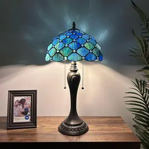 ENJOY DECOR LAMPS Tiffany Style Table Lamp Green Blue Stained Glass Included LED Bulb for Living Room Dining Room Bedroom Bedside 12"W*12"D*22"H