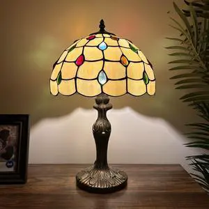 ENJOY DECOR LAMPS Tiffany Style Table Lamp White Stained Glass Crystal Beans Included LED Bulb For Living Room Bedroom Bedside 12"W*12"D*19"H
