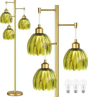 Vintage Floor Lamps for Living Room-3 Light Gold Floor Lamp with Three Bulbs & Glass Lampshape,Glass Mid Century Modern Standing Lamp Tree Tall Flower Floor Lamp for Bedroom Living Room,Corner