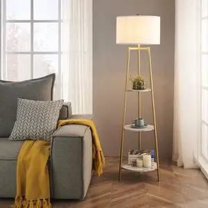 Floor Lamp, Standing Reading Light with Shelves and Gold Shade, Modern Tall Pole Lamp, Accent Furniture Décor Lighting for Living Room, Bedrooms