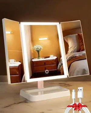 Vanity Mirror with Lights - Rechargeable Lighted Makeup Mirror | 1X/3X/5X Magnification, Smart Touch, 3 Colors Dimmable | Portable Trifold Mirror for Travel - Valentines Day Gifts for Her