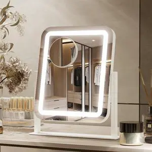 Vanity Mirror with Lights, 16" x 12" LED Makeup Mirror, 3 Modes Light, Smart Touch Control Dimmable, 360°Rotation, Rectangle White Frame, with 5X Magnifying Glass
