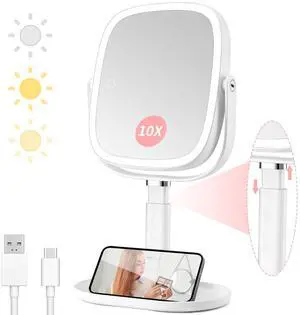 Lighted Makeup Mirror, 2600mAh Rechargeable 1x/10x Magnifying Vanity Mirror, 8.5" Height Adjustable Makeup Mirror with Lights 3 Color, 360° Rotation 2-Sided Light up Large Desk Mirror, Gifts for Women