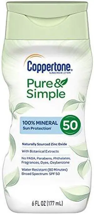 Coppertone Pure Simple Baby SPF 50 Sunscreen Lotion, Water Resistant, Pediatrician Recommended, Zinc Oxide Mineral Sunscreen Lotion, 6 Oz