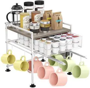 Coffee Bar Organizer Countertop, 2 Tier Mug Cup Holder Stand with 10 Hooks, 60 K Cup Coffee Pod Drawer with Mug Rack, Multifunctional Shelf Organizer for Kitchen, Grey
