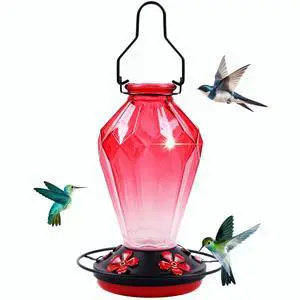 Glass Hummingbird Feeder for Outdoors Hanging, 25Oz Humming Bird Nectar Feeder, Perch, 5 Flower Feeding Ports, Leak Proof Base, Hook for Outside Garden Backyard, Gift for Women Mom, Diamond Red