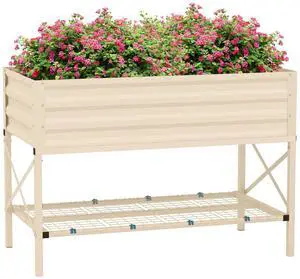 Raised Garden Bed with Galvanized Steel Frame, Storage Shelf and Bed Liner, Elevated Planter Box with Legs for Vegetables, Flowers, Herbs, Cream