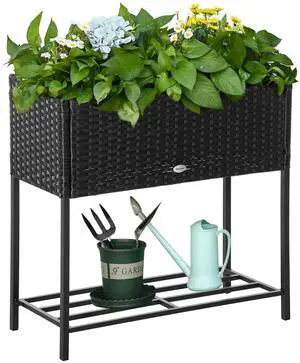 Raised Garden Bed, Elevated Planter Box with Rattan Wicker Look, Tool Storage Shelf, Portable Design for Herbs, Vegetables, Flowers, Black