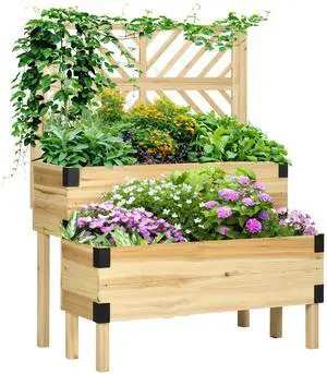 Raised Garden Bed with Trellis, 2 Tier Wooden Elevated Planter Box with Legs and Metal Corners for Vegetables, Flowers, Herbs, Natural