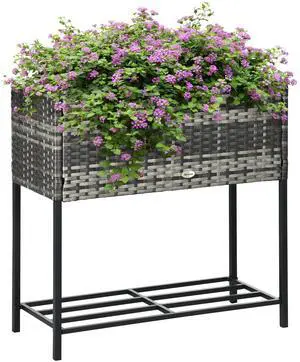 Raised Garden Bed, Elevated Planter Box with Rattan Wicker Look, Tool Storage Shelf, Portable Design for Herbs, Vegetables, Flowers, Gray