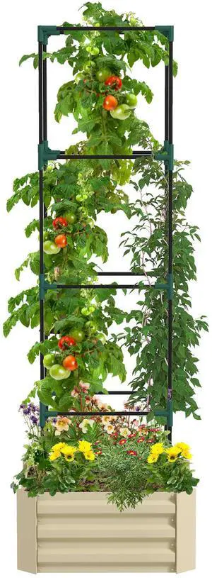 Galvanized Raised Garden Bed, 24" x 24" x 11.75" Outdoor Planter Box with Trellis Tomato Cage and Open Bottom for Climbing Vines, Vegetables, Flowers in Backyard, Garden, Patio, Cream