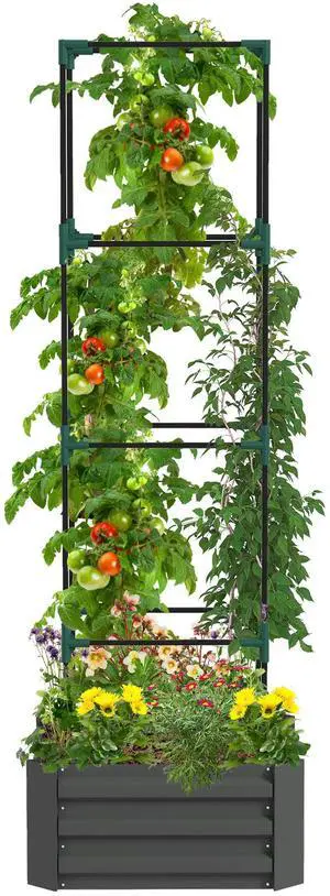 Galvanized Raised Garden Bed, 24" x 24" x 11.75" Outdoor Planter Box with Trellis Tomato Cage and Open Bottom for Climbing Vines, Vegetables, Flowers in Backyard, Garden, Patio, Gray