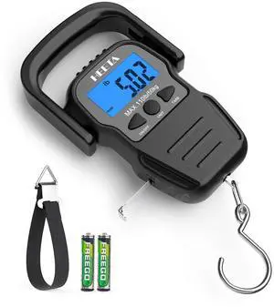 Fish Scale with Backlit LCD Display, Up to 110lb/50kg Digital Portable Hanging Fish Weight Scale with Hook & Measuring Tape for Home Farm Outdoor Hunting Fishing, 2 AAA Batteries Included, Black