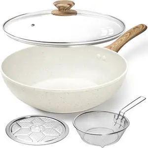 MICHELANGELO 12 Inch Wok Pan with Lid - Woks & Stir-Fry Pans Nonstick Wok with Lid, Stir Fry Pan with Cool-Touch Handle, Induction Wok Set with Stainless Steamer & Fryer Basket