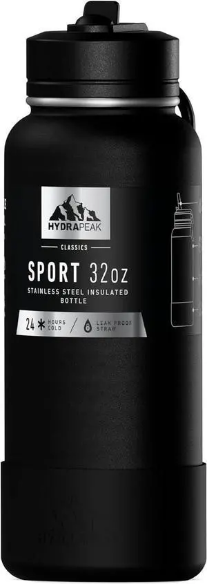 Hydrapeak 32oz Sport Insulated Water Bottle with Straw or Chug Lid, Leak & Spill Proof, Keeps Drinks Cold for 24 Hours, Hot for 12 Hours, Premium Stainless Steel Water Bottles (32oz, Black)