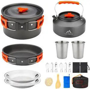17pcs Camping Cookware Kit, 0.45Gal Pot, 7inches Pan,0.30Gal Kettle Set with 2 Set Stainless Steel Cups Plates Forks Knives Spoons for Hiking,Camping,Backpacking,Outdoor Cooking and Picnic