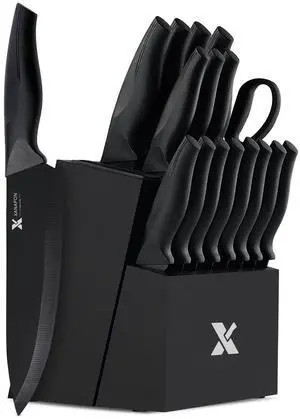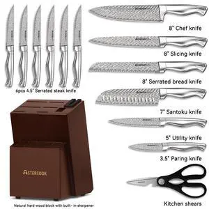 - Set Includes: Block and Sharpener, 8" Chef knife, 8" Slicing knife, 8" Serrated bread knife, 7" Santoku knife, 5" Utility knife, 3.5" Paring knife, 1 Pcs kitchen shears, 6 Pcs 4.5" serrated steak knife
