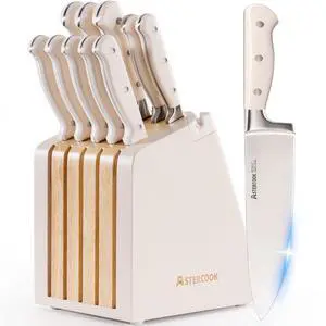 Knife Set, 15 Pieces Kitchen Knife Set with Sharpener Block, German Stainless Steel Knives Set with Anti-Rust Coating, Dishwasher Safe Elegant Cream White Knife Block Sets, Valentine's GiftLimited time offer, ends 03/29