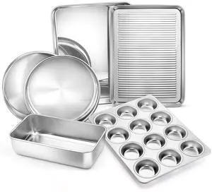 6-Piece Baking Pans set, Stainless Steel Bakeware Set for Oven, Include 8-Inch Cake Pan/Rectangle Baking Cookie Sheet/Muffin/Loaf Pan, Non-Toxic & Heavy Duty, Dishwasher Safe