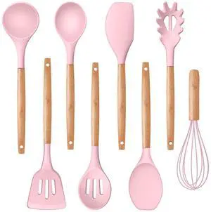 Silicone Cooking Utensils Set, 8-Piece Kitchen Cooking Utensil with Wooden Handle, Silicone Spatula for Nonstick Cookware, Heat-proof & Easy Clean, Pink