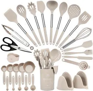 28 Pcs Silicone Cooking Utensils Set with Stainless Steel Handle, 446 Heat-Resistant Kitchen Utensils Set with Holder, Dishwasher Washable Silicone Spatula for Non-stick Cookware (Khaki)