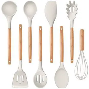 Silicone Cooking Utensils Set, 8-Piece Kitchen Cooking Utensil with Wooden Handle, Silicone Spatula for Nonstick Cookware, Heat-proof & Easy Clean, Khaki