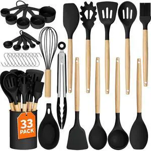 Kitchen Utensils Set - 33 PCS, Heat-Resistant Silicone Cooking Utensils Set with Wooden Handle, BPA-Free Kitchen Gadgets Spatula Sets with Holder for Nonstick Cookware (Black)