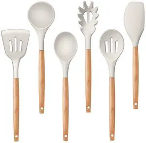 Cooking Utensils Set, 6 PCS Kitchen Utensils with Wooden Handle, Silicone Spatula for Nonstick Cookware, Easy Clean & Non-toxic, Khaki