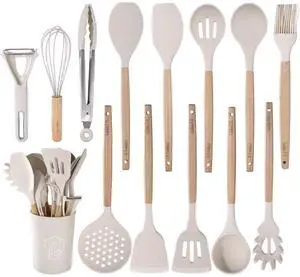 Silicone Kitchen Utensils Set 14pcs, Heat Resistant BPA Free Cooking Tools With Wooden Handles, Safe For Nonstick Cookaware, Beige