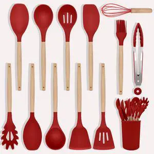 Kitchen Utensils Set 12 Pieces Nonstick Silicone Cooking Utensils Wood Handle Silicone Cooking Utensils Set with Holder Dishwasher Safe BPA Free(red)