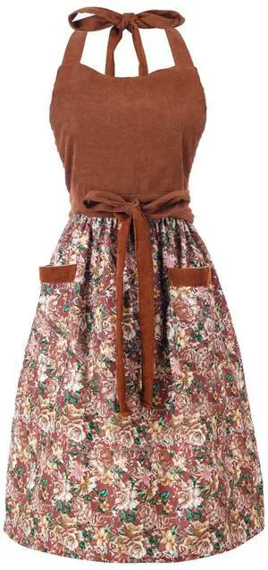 Cute Floral Aprons for Women with Pockets,Cotton Adjustable Neck Strap Apron for Kitchen Cooking Baking Gardening (Brown, Medium)