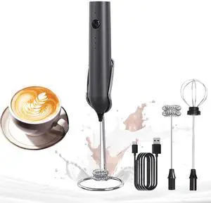 Electric Milk Frother Wand with Stainless Steel Whisk and Stand, Fast Rechargeable Coffee Mixer with 3 Speeds, Handheld Drink Stirrer, Whisk Foam Maker for Lattes, Cappuccino, Matcha (Black)