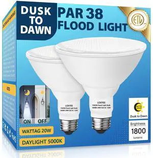 2 Pack LED PAR38 Dusk to Dawn Flood Light Bulbs Outdoor 20W(200W Equivalent) E26 Base Flood Light Bulbs,5000K Daylight 1800 Lumens LED Flood Light for Outdoor Garden,Garage,Yards