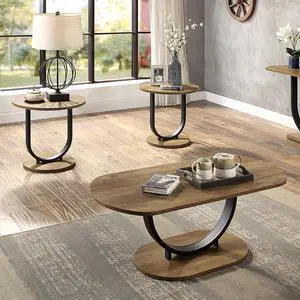 Industrial Style 3pc Coffee Table Rustic Oak And Sand Black Finish U-Shape Base Steel 1x Oval Coffee Table 2x Round End Table Replicated Wood Top