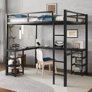 Full Size Metal Loft Bed with Desk and Metal Grid, Stylish Metal Frame Bed with Lateral Storage Ladder and Wardrobe, White