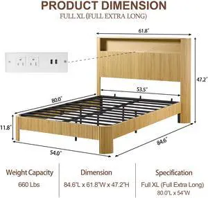 Full Extra Long(Full XL) Size bed frame with storage headboard, built-in charging station, wavy curved lines design, silent operation, metal support, Natural
