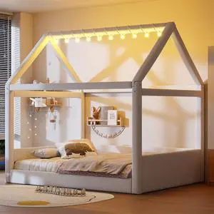 Full Size Upholstered House Daybed with LED Light Strips,Beige