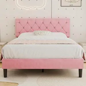 VECELO Full Size Bed Frame with Diamond Tufted Headboard, Upholstered Platform Bedframe with Wood Slat Support, No Box Spring Needed, Mauve Pink