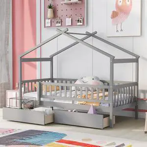 Twin Size Wooden House Bed with Twin Size Trundle, Natural