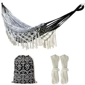 Black with Wirte Bohemian Striped Fringe Double Hammock - Soft Cotton Fabric Outdoor Indoor Hanging Bed with Durable Ropes, Space-Saving Design for Garden, Patio, Backyard, Porch, Beach Camping