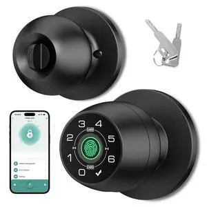 Fingerprint Door Lock, Smart Door Knob with Lock, Biometric Door Lock with App Control & Key, Keyless Door Locks for Bedrooms, Front Door, Home, Finger Print Door Knobs Black, 1 Pack