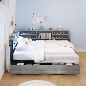 Full Corner Daybed with Storage, Bookcase Headboard, LED Light & Built-in Charging Station