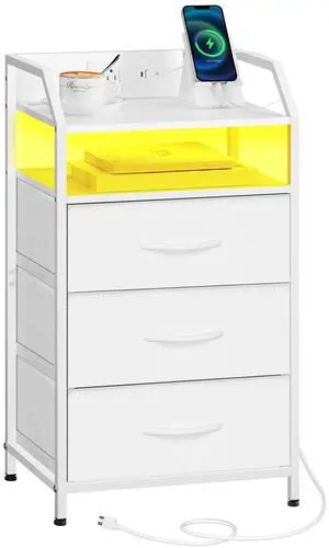 LED Night Stand with Charging Station, Small Bedside Table with USB Ports & Outlets, 2 Fabric Storage Drawers with PU Finish for Bedroom, White, HETS02WT-1