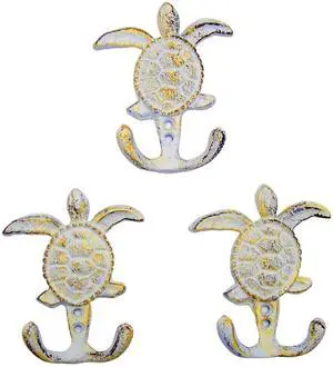 Distressed White Sea Turtle Cast Iron Wall Hook, Yellow Accents, Wall Décor, Set of 3, 4 3/4 Inch