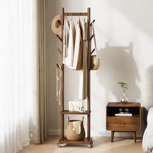 Solid Wood Coat Rack Freestanding - Rolling Clothes Rack with 8 Hooks & Shelves, Small Clothing Rack with Wheels, Heavy Duty Clothing Racks for Hanging Clothes, Portable Hall Tree for Entryway