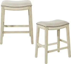 OSP Home Furnishings Metro 24-inch Counter Height Saddle Stool with Nailhead Trim 2-Pack, Antique White Base with Beige Fabric