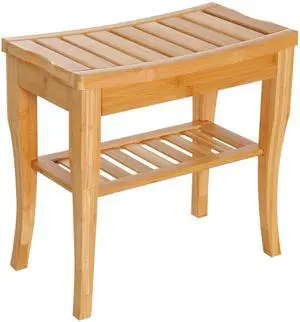 Long Bamboo Shower Bench Seat, 20" Wooden Spa Shower Stool with Underneath Storage Shelf Shoe Organizer