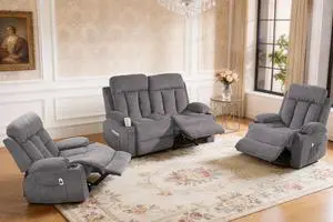 VANBOW Manual Recliner Sofa Set, 3 Piece Reclining Living Room Furniture Sets with Cup Holders for Home Theater, Office (Grey, Loveseat+Chair+Chair)