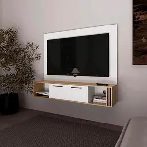 Selma Floating 63" Wide Tv Stand with Two Cabinets, Six Shelves, Cable Management , Entertainment Center for Living Room , Wall Shelf Cabinet Natural Oak - White